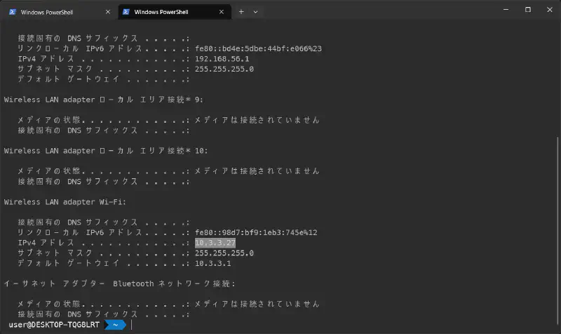 ターミナルで ipconfig コマンドを実行すれば、PCのIPアドレスを取得できます.