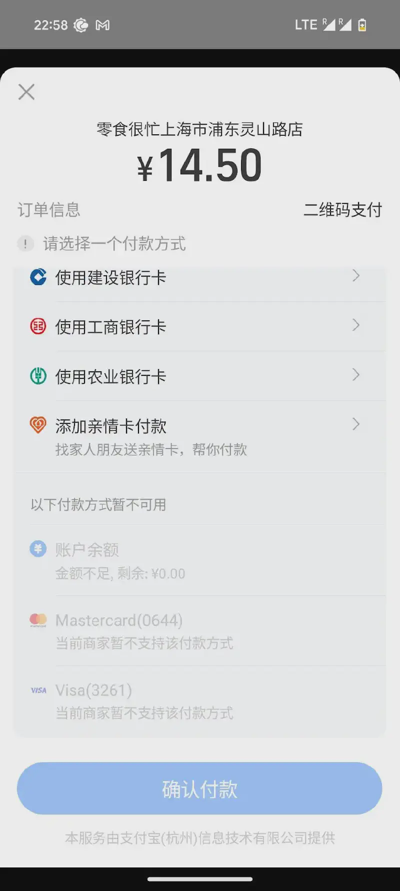 ホテルの隣で開業したお店では、朝に来店したときは難なく支払えたのに、夜にまた来ると設定を変えたのか WeChat Pay でも Alipay でも支払えませんでした.