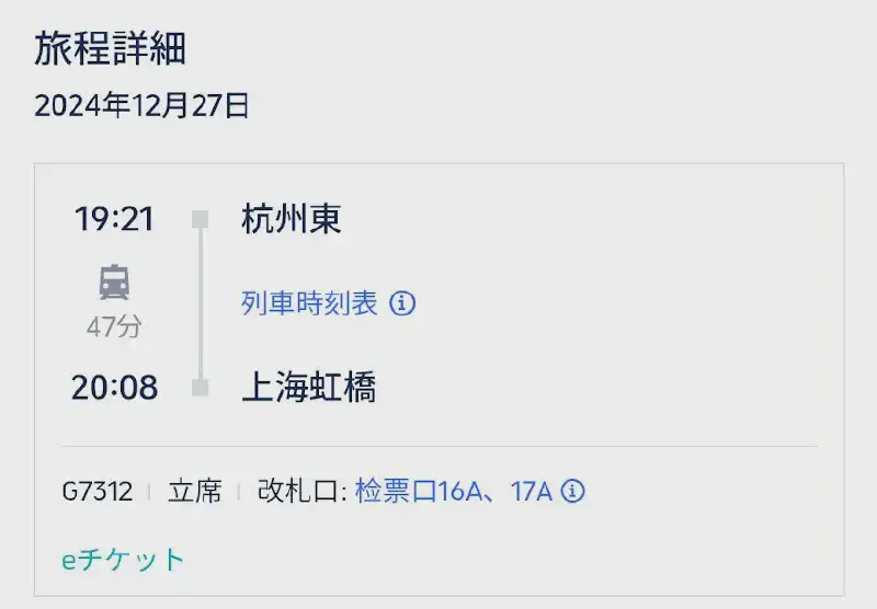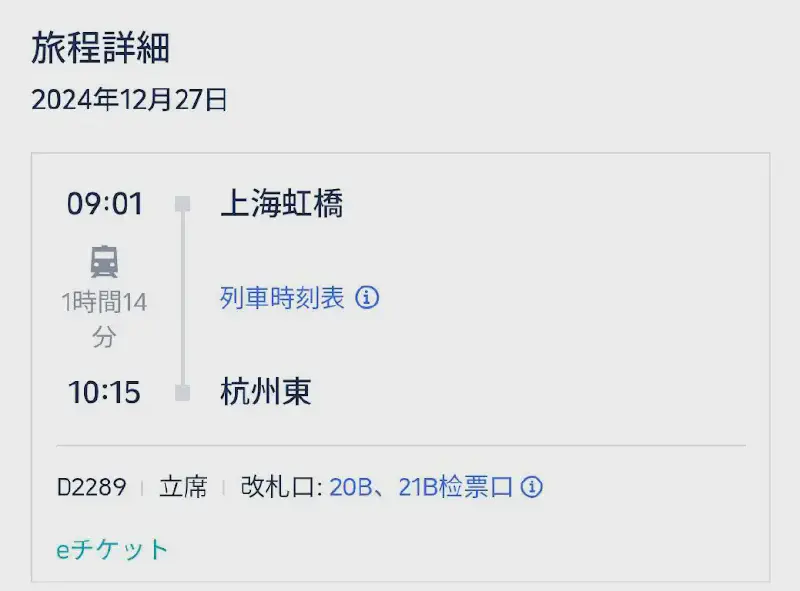 | 上海虹橋站 \(\xrightarrow{🚄}\) 杭州東站 | 1598 | D列車、立席 | |
