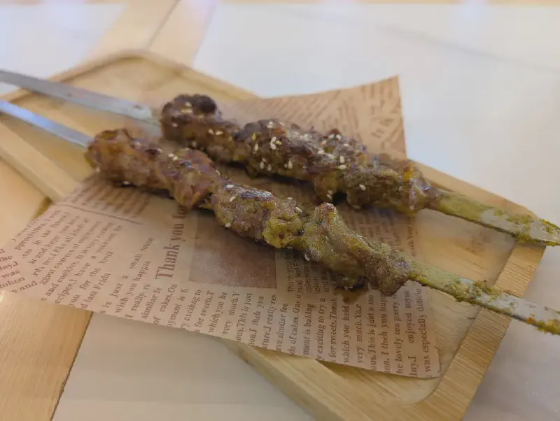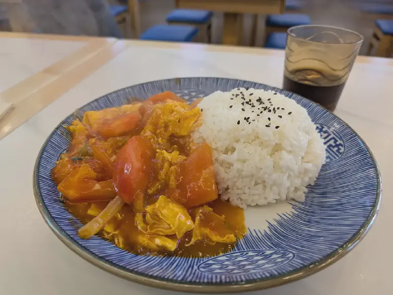 昨晩と同じお店で朝食をとります.「番茄鸡蛋盖饭」と「钢钎羊肉大串」を頼みました!