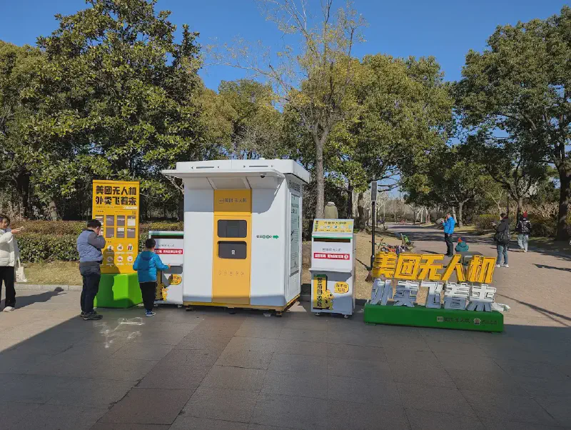 「美团无人机空投柜」(美団無人機空投櫃)を見に公園へやってきました!ドローンが商品を届けてくれるというものです.