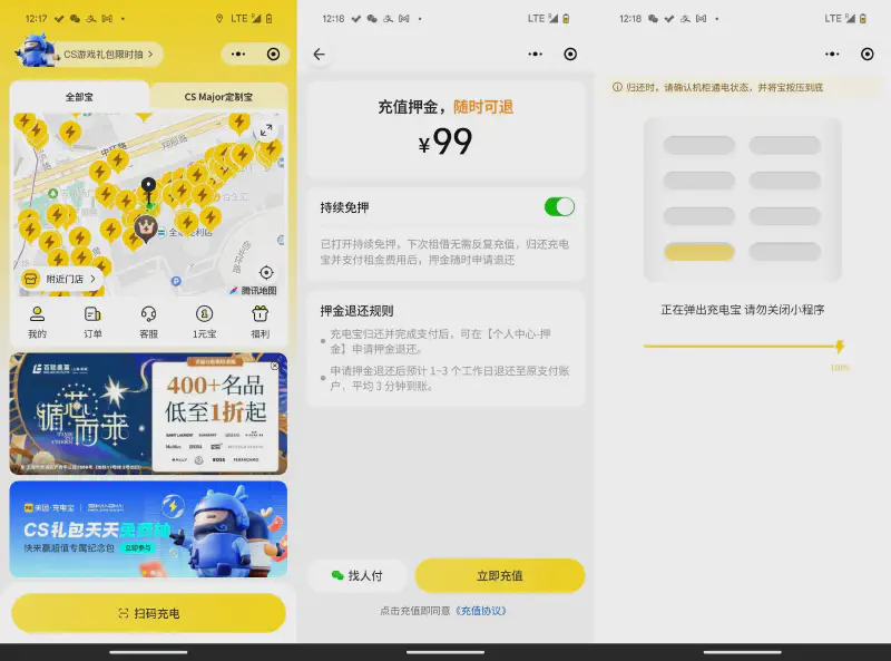 QRコードをWeChatで読み込み、いつでも返金してもらえるデポジット💰2,223円(99元)を支払うことで借りることができました.