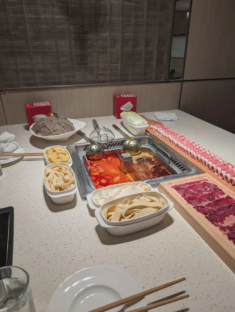 海底捞の辛いスープは本当に辛いので、僕はおすすめしません!!!!!辛いのが好きだというショウコンミュラーチスさんでも想定外の辛さだと言っていました.僕も辛いのは苦手なので、食べ残してしまい勿体なかったですね・・・.