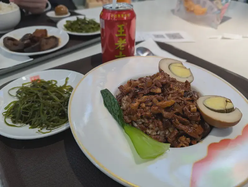 保安検査前にルーロー飯を食べました.赤色の缶の「王老吉」は甘いお茶みたいな飲料です.